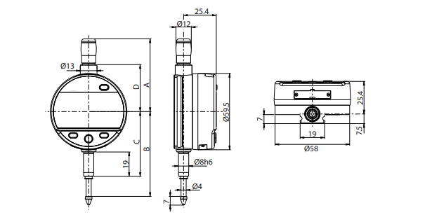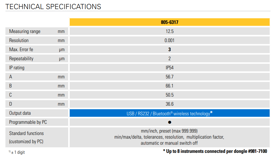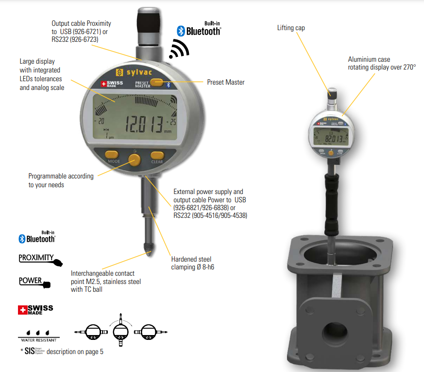 適用於缸徑規上的電子表 特殊軟體功能設計 缸徑規經環規歸零校準後記憶,進入工件游移,顯示最小反轉點 一鍵解除後叫出記憶值即可接續量測,無須再做歸零 量測行程12.5mm,最大誤差3µ 依據孔件角度,表盤可旋轉270°方便量測讀取 內建藍芽晶片,支援無線數據輸出 亦可選配傳輸線,USB/RS232